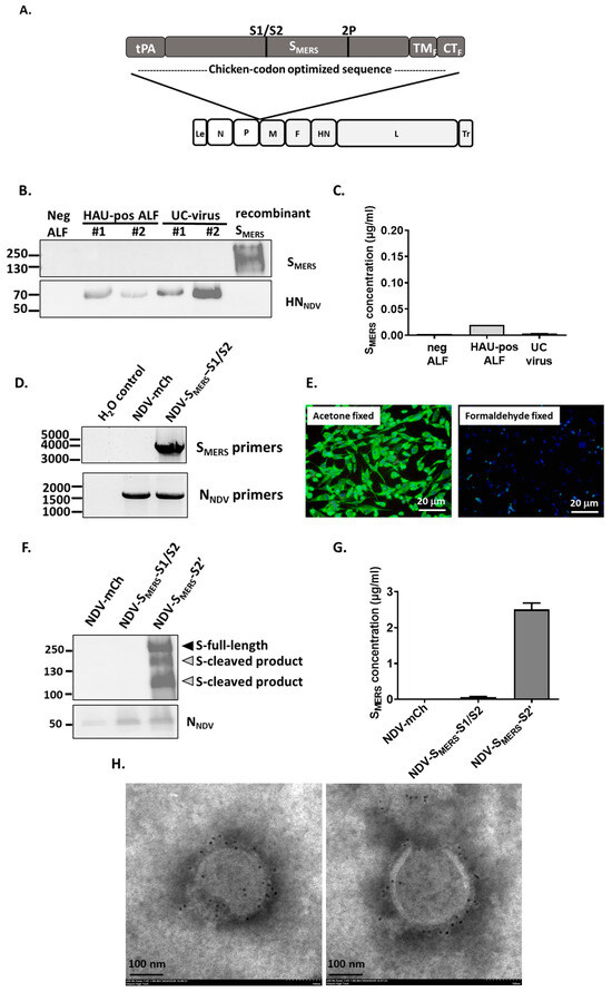Because there is another well-known furin cleavage site at S2’ position of SMERS, we then examined whether an additional mutation at S2’ cleavage site (called SMERS-S2’) would improve SMERS surface expression. As shown in Figure 2F,G, NDV with SMERS-S2’ (called NDV-SMERS-S2’) became ELISA and Western blot positive for SMERS detection. Further verification by anti-SMERS immune-gold staining observed under a TEM also confirmed that SMERS-S2’ was expressed on the surface of NDV particles (Figure 2H).