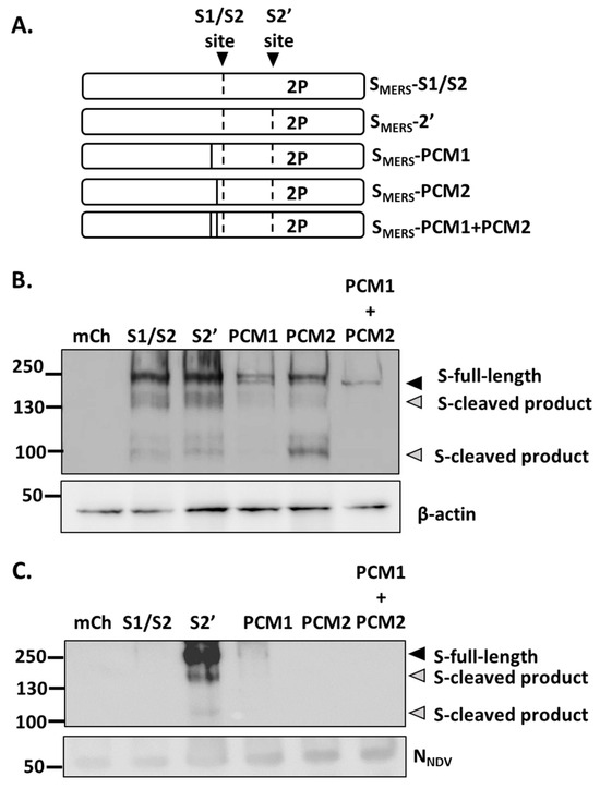 As seen in Figure 2F, a band corresponding to the full-length SMERS of around 200 kDa was clearly observed from the NDV-SMERS-S2’ sample, however bands of lower molecular weights were also detected. We hypothesized that these lower bands were of cleaved SMERS products. Using Prop-1.0 furin cleavage site prediction program (https://services.healthtech.dtu.dk/services/ProP-1.0/ (accessed on 7 November 2023)), two additional furin cleavage sites were predicted at positions 626-RQQR-629 and 691-RSTR-694. Previously Gierer et al. identified these exact mutations and named them as Potential Cleavage Mutation 1, “PCM1”, and Potential Cleavage Mutation 2, “PCM2”, respectively (Figure 3A) [23]. Gierer et al. also reported that Arg to Ala mutations at PCM1 together with S1/S2 site mutation prevented SMERS from being cleaved, and that Arg to Ala mutations at PCM2 unexpectedly reduced the protein expression to an undetectable level.