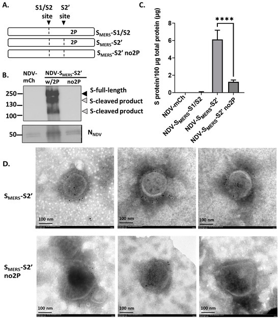 2P mutation improved surface SMERS expression. (A) A diagram comparing the gene insert of NDV-SMERS-S1/S2, NDV-SMERS-S2’, and NDV-SMERS-S2’ no2P. (B) The ultracentrifuged virus samples were subjected to Western blot analysis using anti-MERS-CoV S2 and anti-NDV N antibodies, and (C) an MERS-CoV S1-sandwich ELISA. **** indicates significant difference (p < 0.0001). (D) The ultracentrifuged samples were stained with rabbit anti MERS-CoV S1 antibody, and then the 10-nm gold-conjugated goat anti-rabbit IgGs. Images were recorded under a TEM at 50,000× magnification.