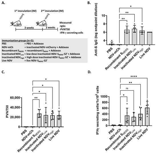 NDV-SMERS-S2’ induced strong humoral and cellular immune responses. (A) Groups of 5 mice were injected intramuscularly twice, 3 weeks apart with PBS + Addavax (PBS), inactivated NDV-mCherry + Addavax (NDV-mCh), recombinant SMERS, low dose inactivated-NDV-SMERS-S2’ + Addavax (Inactivated NDVLow), high dose inactivated-NDV-SMERS-S2’ + Addavax (Inactivated NDVHigh), or live NDV-SMERS-S2’. Two weeks after the second immunization, sera were collected and (B) anti-SMERS IgGs were measured with anti-SMERS IgG indirect ELISA. The last dilutions of sera that gave signals above average + 3x standard deviation of PBS wells are depicted. (C) Mouse sera were subjected to a pseudotype virus neutralization assay (PVNT50). Serum dilutions that yielded 50% of signals from cells transduced with pseudotyped virus alone was calculated using GraphPad Prism 9.0.0 (121). (D) Splenocytes were restimulated with SMERS overlapping peptides for 24 h on IFN-γ ELISPOT plates. Spots representing numbers of IFN-γ secreting cells were developed and then counted using ImmunoSpot software 7.0.9.4 Professional Analyzer DC on a CTL ImmunoSpot S6 Universal Analyzer. Means ± S.D. are presented. One-way ANOVA with Tukey’s multiple comparison post-test was used to calculate significant differences between NDV-mCh and NDV-SMERS-S2’ immunized groups. *, **, **** indicate significant difference p < 0.05, p < 0.01, and p < 0.0001, respectively. ns indicates no significant difference.