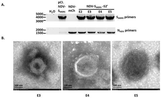 SMERS gene insert was stable after 5 egg-passages. (A) Viral RNAs of NDV-mCh and NDV-SMERS-S2’ from egg-passages 2–5 were purified and subjected to RT-PCRs using SMERS- and NNDV-specific primers. pCI.NDV-SMERS plasmid was used as positive controls. (B) The ultracentrifuged NDV-SMERS-S2’ samples from egg-passage 3–5 (E3, E4, and E5) were stained with rabbit anti MERS-CoV S1 antibody, followed by 10-nm gold-conjugated goat anti-rabbit IgGs. Images were recorded under a TEM at 50,000× magnification.
