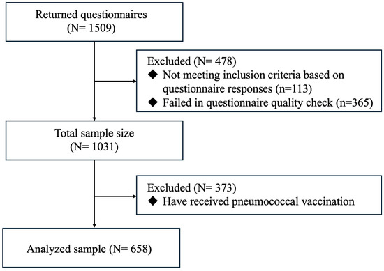 A total of 1509 participants completed the questionnaire and 478 participants were subsequently excluded (113 participants did not meet the inclusion criteria based on questionnaire responses and 365 participants failed in the questionnaire quality check) and the total sample size was 1031. Of the 1031 participants, 658 older adults who had not received pneumococcal vaccination were included in the analysis, while 373 individuals who had received pneumococcal vaccination were excluded as they were not eligible for further vaccination within the recommended interval (Figure 1).