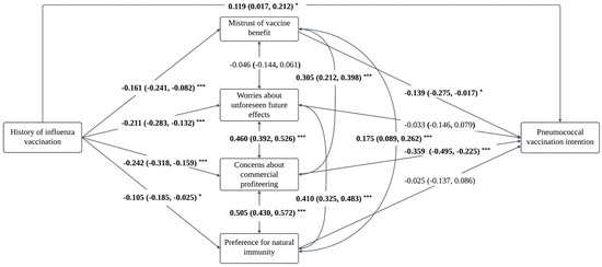 A total of two significant indirect paths were identified. Among the subscales of negative attitudes, concerns about commercial profiteering had the largest mediating effect (36.6%, standardized estimate = 0.087 [0.049, 0.136]), followed by mistrust of vaccine benefits (9.2%, standardized estimate = 0.022 [0.004, 0.054]). Worries about unforeseen future effects and preference for natural immunity did not significantly mediate the association between influenza vaccination history and pneumococcal vaccination intention.