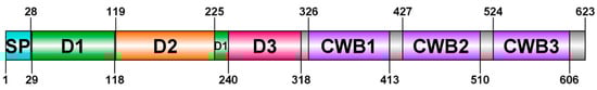 Domain architecture of cell wall protein 2 (Cwp2) (WP_009891054.1) from C. difficile R20291. The signal peptide (SP) is followed by the functional region, which includes domain 1 (D1), domain 2 (D2), and domain 3 (D3); D2 is connected to D3 via a strand of 13 aa in D1. The cell wall binding domain (CWB) has 3 repeated regions, CWB1, CWB2, and CWB3, as indicated in UniProt. The schematic representation of the domain architecture was developed in DOG 2.0.