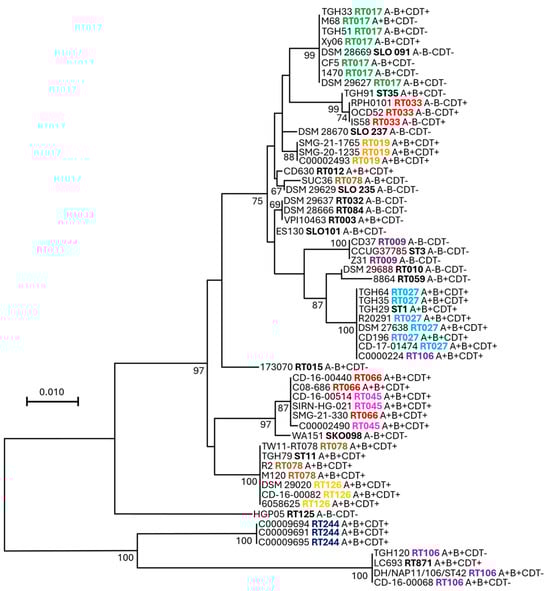 Cwp2 phylogeny. Amino acid sequences of Cwp2 were aligned with the MUSCLE algorithm in MegaX before computing a maximum likelihood tree with 100 bootstrap replicates (bootstrap values >50 are displayed). Scale bars indicate 0.010 substitutions per site. The ribotype (or sequence type) of each source strain is displayed adjacent to the strain name. Ribotypes with multiple representatives have multicolored labels, while black labels indicate ribotypes with only one representative on the tree. Toxinotypes for each strain are indicated to the right of the ribotype for each strain.