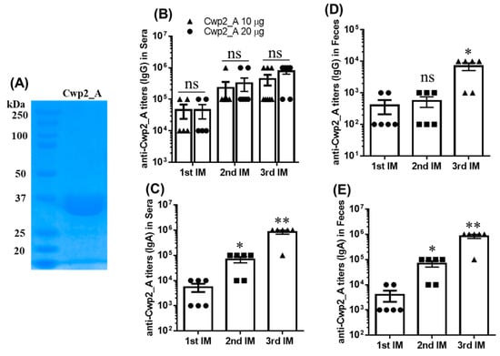 (A) Expression and purification of Cwp2_A. Cwp2_A was cloned in E. Coli BL21, and the protein was purified and analyzed on SDS-PAGE. (B) Immunization with Cwp2_A via the intraperitoneal (i.p.) route elicited anti-Cwp2_A antibody responses. Groups of mice (n = 5–8) were immunized three times with 10 µg or 20 µg of Cwp2_A with aluminum. In (C–E), 20 µg of protein was used. Anti-Cwp2_A IgG/IgA titers in sera and feces were determined using an ELISA analysis. Data are presented as the mean ± SEM (* p < 0.05; ** p < 0.01; ns, not significant; 2nd and 3rd IM vs. 1st IM in (C–E)).