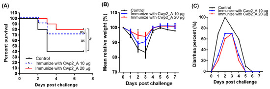 Immunization with Cwp2_A provides mice significant protection against infection with C. difficile. Immunized mice or controls (non-immunized mice) (n = 10) were challenged with C. difficile R20291 spores (106/mouse). Survivals (A), weight changes (B), and diarrhea percentages (C) are shown. Data are presented as the mean ± SEM (ns, not significant; * p < 0.05; in (B), immunization with 20 µg vs. control).