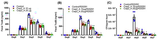 An ELISA analysis was performed as described previously [41]. Briefly, Costar 96-well ELISA plates were coated with 100 µL/well of Cwp2_A (0.5 µg/mL) and incubated overnight at 4 °C. Unbound material was washed off, and the wells were blocked with 300 µL of blocking buffer (PBS + 5% dry milk) for 2 h at room temperature. Subsequently, 100 µL of 10-fold diluted sera or fecal samples were added to each well and incubated for 1.5 h at room temperature. After washing with PBS, 100 µL of either HRP-conjugated mouse IgG (1:3000) or IgA (1:3000) was added and incubated for 30 min to 1 h. Following another PBS wash, TMB substrate was added to induce color development for 5–30 min at room temperature. The reaction was terminated by adding H2SO4, and the optical density (OD) at 450 nm was measured using a spectrophotometer. The anti-Cwp2_A IgG/A titer for each sample was defined as the dilution factor at which the OD450nm was at least 2-fold higher than that of serum samples from non-immunized mice.