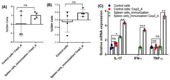 T cell responses. Splenocytes from immunized (n = 3–4) and unimmunized (n = 4) mice were isolated 13 days after the second immunization with Cwp2_A and stimulated with Cwp2_A at 10 µg/mL for 72 h (A,B) or 6 h (C). The proliferative responses of CD4+ (A) and CD8+ (B) T cells were assayed by staining with appropriate antibodies and were analyzed by flow cytometry. (C) IL-17, IFN-γ, and TNF-α expression in the spleen cells was determined by qPCR processing. The y-axis value indicates the expression ratio relative to GAPDH. Data are presented as the mean ± SEM (N = 3, * p < 0.05, ** p < 0.01, *** p < 0.001, ns, not significant).