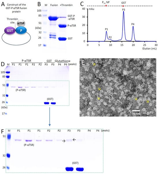 The P-αTSR protein was initially generated as a soluble GST-tagged protein (Figure 1A) via an E. coli expression system, yielding approximately 20 mg of target protein per liter of bacterial culture. This was achieved by isolating the target protein from the bacterial lysate using GST-binding resin (Figure 1B, middle lane, ~68 kDa). The purified GST-P-αTSR fusion protein was then cleaved using thrombin, resulting in two proteins: a ~42 kDa P-αTSR protein and a ~26 kDa GST (Figure 1B, right lane). The two proteins were separated by gel-filtration chromatography, followed by SDS-PAGE analysis (Figure 1C,D). Gel filtration revealed three major peaks, corresponding to the P-αTSR protein in the form of P24-αTSR NPs (P1, see below), GST (P3), and glutathione (P4) from the elution buffer, respectively.