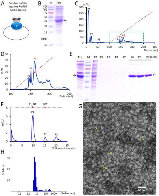 Generation and characterization of tag-free P-αTSR protein and P24-αTSR NPs. (A) Schematic representation of the tag-free P-αTSR protein construct. (B) SDS-PAGE analysis of the P-αTSR protein precipitated with ammonium sulfate [(NH4)2SO4]. The left lane (M) shows prestained protein standards, with molecular weights (MWs) labeled in kDa. The right lane (PPT) displays the P-αTSR protein (denoted by an arrow) precipitated from bacterial lysate using 1.2 M (NH4)2SO4. (C,D) Representative elution profile from anion exchange chromatography of the (NH4)2SO4-precipitated P-αTSR protein. (D) Is an enlarged view of the framed region in (C). The Y-axis represents relative protein amounts in the eluents, measured by ultraviolet absorbances at 280 nm (A280, mAU), while the X-axis indicates the accumulated elusion volume (mL). The dashed red line shows the linear gradient of buffer B (0–100%), with a red star marking the percentages of buffer B at the elution peak of the P-αTSR protein (33.9%, P6). Six major elution peaks (P1 to P6), analyzed by SDS-PAGE in (E), are indicated. (E) SDS-PAGE analysis of the six major elution peaks from the anion exchange chromatography in (C,D). Lane “Pre”: redissolved ammonium sulfate-precipitated protein before loading. Lane M: prestained protein standards with MWs indicated in kDa, as in (B). The tag-free P-αTSR protein (~68 kDa) is present in P6, as indicated by an arrow. (F) Elution curve from gel filtration of the purified tag-free P-αTSR protein. The curve shows a single major peak in the void volume (P1), corresponding to the P24-αTSR NP (MW > 800 kDa). Two minor peaks (P2 and P3) appeared. P2 likely represents dimeric P-αTSR protein with an MW similar to the GST dimer (~52 kDa), while P3 may represent degraded protein fragments with MWs < 10 kDa. The Y-axis indicates relative protein amounts, while the X-axis represents the elution volume, as in (C,D). The dashed line at the top, marked with two stars, indicates the elution positions of the P24 NP (~830 kDa) and GST dimer (~52 kDa). (G) Representative transmission electron microscopy (TEM) image of the P-αTSR protein from P1 in (F), showing the formation of the P24-αTSR NPs. Arrows point to typical P24-αTSR NPs. (H) The particle size distribution of the tag-free P24-αTSR NPs, determined by dynamic light scattering (DLS).