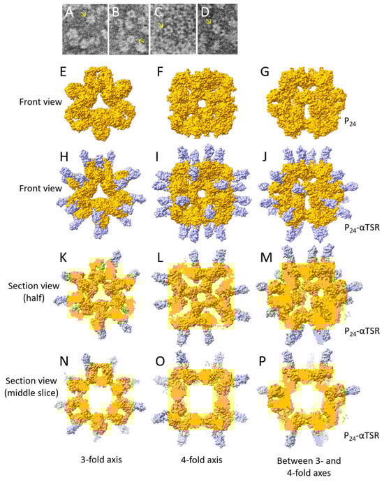 TEM micrographs of the P24-αTSR NPs revealed the characteristic morphologies of the octahedral P24 NP [18], with recognizable extended protrusions corresponding to the αTSR domains (Figure 3A–D). Additional shapes were also observed in the micrographs. To better understand these morphologies, a 3D model of the P24-αTSR NP was constructed, using the cryo-EM structures of the P24 NP [18] (Figure 3E–G) and the P24-VP8* [56] NP as templates. This was achieved by fitting the known crystal structures of the αTSR domains of P. falciparum (PDB code: 3VDJ) [34] into the VP8* density maps of the P24-VP8* NP, using UCSF ChimeraX software. Based on this octahedral model, we generated representative images of the P24-αTSR NP from various viewing angles (Figure 3H–P), including views along the three-fold (Figure 3H,K,N) and four-fold (Figure 3I,L,O) symmetry axes, as well as intermediate angles between the two (Figure 3J,M,P). In summary, the octahedral P24-αTSR NPs do not display typical spherical shapes; instead, they may appear as rectangles, pentagons, and/or hexagons, depending on the viewing angle. These visualizations provide valuable insights into the diverse morphologies observed in the TEM micrographs.
