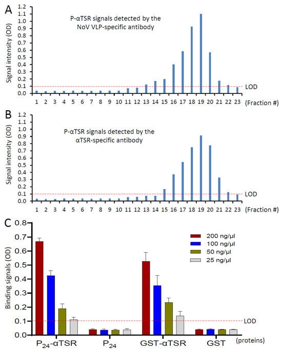 This procedure was carried out as previously described [35]. Briefly, heparin sulfate (HS) in the form of heparin sodium salt purified from porcine intestinal mucosa (Sigma-Aldrich, St. Louis, MO, USA) at a concentration of 25 µg/mL was coated onto 96-well microtiter plates (Thermo Fisher Scientific, Waltham, MA, USA). The P24-αTSR NP, at different concentrations, was incubated with the coated heparin, with the GST-tagged αTSR [35] serving as a positive control and the P24 NP [18] and GST serving as negative controls. Bound P24-αTSR NP/P24 NP proteins were detected using guinea pig hyperimmune serum against norovirus VLP [60] at 1:3000 dilution, while bound GST-αTSR/GST proteins were detected using mouse hyperimmune serum against GST-αTSR [35] at 1:2000 dilution. Horseradish peroxidase (HRP)-conjugated goat anti-guinea pig IgG or mouse IgG (Thermo Fisher Scientific) at a 1:5000 dilution was used to measure the bound antibodies. Finally, HRP substrates were added to determine the signal intensity, which was defined by the optical density (OD) at 450 nm.