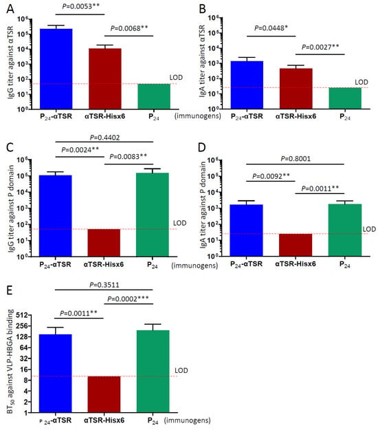 Immune responses to the P24-αTSR NP toward its bipartite components. (A,B) Plasmodium αTSR-specific IgG (A) and IgA (B) titers in mice immunized with the P24-αTSR NP (blue column) compared to titers induced by free αTSR (red column) and the P24 NP (green column) after three intramuscular immunizations. (C,D) Norovirus P domain-specific IgG (C) and IgA (D) titers in mice immunized with the P24-αTSR NP (blue column) compared to titers induced by free αTSR (red column) and the P24 NP (green column) after three intramuscular immunizations. In (A,C), the Y-axes represent αTSR-specific (A) or P domain-specific (C) IgG titers. In (B,D), the Y-axes represent αTSR-specific (B) or P domain-specific (D) IgA titers. In (A–D), the X-axes indicate various immunogens. (E) The 50% blocking titers (BT50) of sera from mice immunized with the P24-αTSR NP (blue column), P24 NP (green column), and free αTSR (red column) against norovirus VLP-glycan receptor attachment. The Y-axis represents BT50 values, while the X-axis indicates various immunogens. Corresponding statistical p values between the data groups are displayed above the columns. The limit of detection (LOD) is indicated by a red dashed line in each panel. Differences were deemed not significant at p-values > 0.05, significant at p-values < 0.05 (marked as “*”), significant at p-values < 0.01 (marked as “**”), and highly significant at p-values < 0.001 (marked as “***”).