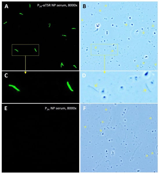 Specific staining of P. falciparum sporozoites by sera from mice immunized with the P24-αTSR NP, in immunofluorescence assays (IFAs). (A) Representative IFA micrograph showing Plasmodium sporozoites stained by mouse sera (1:8000 dilution) after three immunizations with the P24-αTSR NP. (C) Enlarged view of the marked regions in (A). (E) Sera (1:8000 dilution) from mice immunized with the P24 NP showed no staining of sporozoites (negative control). (B,D,F) Optical views of the same fields correspond to the IFA images in the left panels. Arrows indicate the visualized sporozoites.