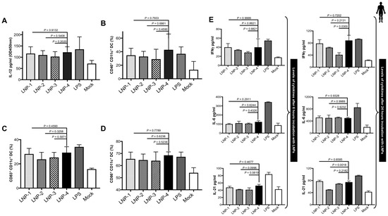 LNP stimulation and immunogenicity. (A) IL-12 secretion by monocyte-derived DCs after 24 h of stimulation with 1.2 μg/mL of different LNPs. (B) Activation status of monocyte-derived DCs as measured by CD40 expression after 24 h of stimulation with 1.2 μg/mL of different LNPs. (C,D) Expression of maturation markers CD83 (C) and CD86 (D) on DCs following stimulation with 1.2 μg/mL of different LNPs. (E) Dynamics of cytokines from PBMCS at 6 and 24 h after LNP stimulation.