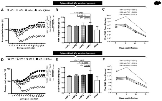 Weight loss analysis showed that all hamsters in the mock group lost body weight and displayed a mean reduction of 4–5% of body weight by day 4 (Figure 3A,D). Immunized hamsters showed a mean increase of 2–3% (1 µg) and 2–4% (3 µg) in body weight (Figure 3A,D). However, hamsters immunized with LNP-4 demonstrated better weight gain and overall maximum weight (Figure 3B,E). The viral titration data show relatively decreased viral RNA copy numbers for hamsters immunized with LNP4 at 1 µg (Figure 3C) and 3 µg (Figure 3F) in comparison to other LNPs.