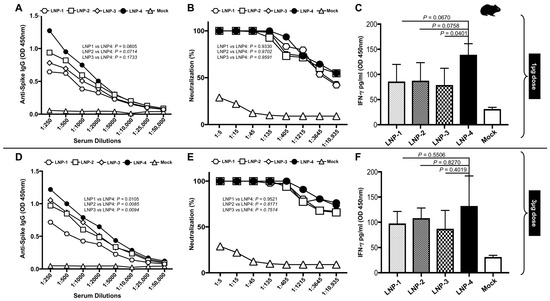 4. Vaccination with mRNA-Spike encapsulated in LNP-4 induced a higher level of Interferon-γ: The heparinized, fresh, whole blood collected from each hamster immunized with different LNPs was incubated with SARS-CoV2 Spike-specific peptides for 24 h. The presence of IFN-γ in the plasma samples was determined by ELISA. Peripheral blood obtained from hamsters immunized with LNP-4 showed a higher production of IFN-γ in vitro followed by hamsters immunized with LNP-2, LNP-3, and LNP-1 (Figure 4C,F).