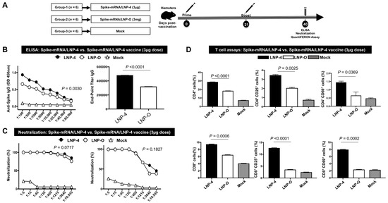 Immunogenicity comparison of LNP-4 with off-the-shelf LNP (LNP-O): (A) Schematic of experimental design. Syrian golden hamsters were vaccinated with 3 μg of LNP4 and LNP-O-encapsulating Spike protein intramuscularly twice (21 days apart). Four weeks after the first immunization, blood samples were collected from hamsters under isoflurane anesthesia and spun to obtain serum. (B) Spike-specific serum immunoglobulin (Ig) G or A binding antibody responses obtained from hamsters immunized with 3 μg of Spike-mRNA/LNP (LNP-4 vs. LNP-O) as measured by ELISA. (C) Serum-neutralizing antibody titers obtained from hamsters immunized with 3 μg of Spike-mRNA/LNP (LNP-4 vs. LNP-O) as measured by a plaque reduction neutralization test. (D) Analysis of T-cell responses in the peripheral blood of hamsters immunized with 3 μg of Spike-mRNA/LNP (LNP-4 vs. LNP-O).