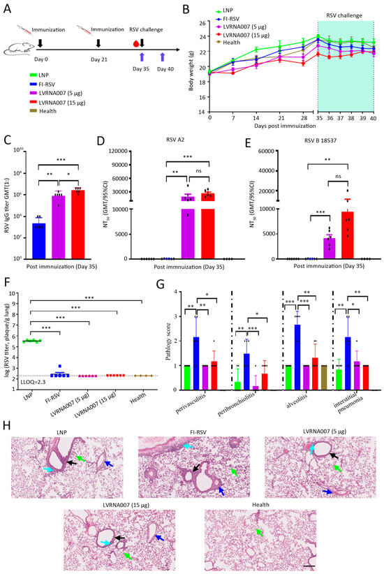 LVRNA007 protected mice from RSV challenge without inducing VED. (A) Schematic depiction of the experimental strategy. Mice were immunized i.m. on days 0 and 21 with LVRNA007 (5 μg or 15 μg), FI-RSV (0.05 μg), or LNP and challenged intranasally with 5 × 105 PFU of RSV A2 on day 35. The Health group was not treated. (B) Body weight was recorded and diagramed for 40 days. (C) Specific binding antibody levels in the mice were analyzed using ELISA on day 35. (D,E) Neutralizing antibody titers against RSV A2 and RSV B 18537 strains were measured in serum samples on day 35. (F) RSV titer was measured in the lung tissue. (G) Pathological score was calculated on day 40. (H) Histopathological examination of lung tissue was conducted using HE staining. Scar bar, 200 μm. The blue arrows indicate perivasculitis. The black arrows indicate peribronchiolitis. The green arrows indicate alveolitis. The cyan arrows indicate interstitial pneumonia. n = 6. *, p < 0.05; **, p < 0.01; ***, p < 0.001; and ns, no significance.