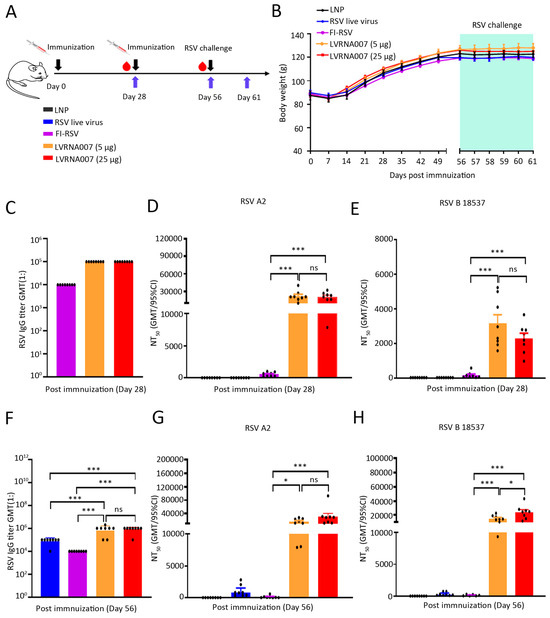 Effect of LVRNA007 on binding and neutralizing antibody titers in cotton rats. (A) Schematic depiction of the experimental strategy. Cotton rats were vaccinated i.m. on days 0 and 21 with LVRNA007 (5 µg or 25 µg), FI-RSV (0.05 μg), or LNP. The RSV live virus group received 5 × 105 PFU of RSV A2 intranasally on day 28. All animals were challenged intranasally with 1 × 106 PFU of RSV A2 on day 56. (B) Body weights of cotton rats were monitored and diagramed for 61 days. (C) Binding antibody levels in cotton rats were determined using ELISA on day 28. (D,E) Neutralizing antibody titers in serum against RSV A2 and RSV B 18537 strains were examined on day 28. (F) Binding antibody levels in cotton rats were measured using ELISA on day 56. (G,H) Neutralizing antibody titers in serum against RSV A2 and RSV B 18537 strains were analyzed on day 56. n = 8. *, p < 0.05; ***, p < 0.001; and ns, no significance.