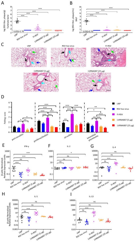 To further evaluate the effects of LVRNA007 on VED, cotton rats were challenged with RSV on day 56. Five days post-challenge, turbinate bone and lung tissue samples were collected and used for RSV titers. The results revealed that RSV titers of the turbinate bone and lung washes from the LNP-immunized group were significantly higher than those of the other groups (Figure 5A,B), suggesting that LVRNA007 (5 µg or 25 µg), RSV live virus, and FI-RSV immunization remarkably decreased RSV titers in the noses and lung tissue. Perivasculitis, peribronchiolitis, alveolitis, and interstitial pneumonia were analyzed using HE staining. Compared with LVRNA007-immunized animals, FI-RSV-immunized animals exhibited significant perivasculitis, peribronchiolitis, alveolitis, and interstitial pneumonia following the RSV challenge. Moreover, cotton rats vaccinated with LVRNA007 (5 µg or 25 µg) had lower pathology scores of peribronchiolitis and interstitial pneumonia than those immunized with LNP (Figure 5C,D). Furthermore, cytokine levels in the lung tissue revealed that the IFN-γ mRNA level was lower in LVRNA007 (5 µg or 25 µg)-immunized cotton rats than in LNP- or FI-RSV-immunized cotton rats on day 5 post-challenge (Figure 5E). No significant difference between any of the groups was observed in IL-2 mRNA levels (Figure 5F). The expression of IL-4, IL-5, and IL-13 mRNA was significantly higher in the FI-RSV-immunized group than in the LNP-immunized group (Figure 5G–I). However, no differences in IL-4, IL-5, or IL-13 mRNA levels were observed between the LVRNA007-immunized groups and the LNP-immunized group (Figure 5G–I). The findings implied that LVRNA007 effectively protected against RSV challenge, prevented inflammation, and did not cause VED in cotton rats.