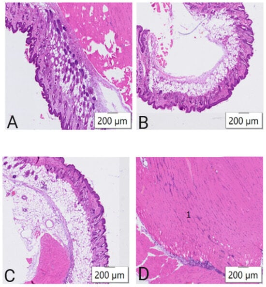To assess tissue damage at the injection site, a histological examination of skin samples and adjacent muscle tissues was performed 48 h post-immunization. The degree of histopathologic changes varied according to the protocol used (Figure 1A–D). No differences from the control were observed with protocols No. 1 and No. 2. However, animals immunized following protocol No. 3 exhibited minor necrotic foci complications.