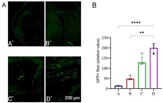 (A). Fluorescence microphotographs of muscle tissue obtained 3 days after immunization by jet injection of GFP plasmid. Samples were collected and then cut into 1 mm thick slices to visualize GFP expression: (A’) control mice (without jet injection); (B’) protocol No. 1; (C’) protocol No. 2; (D’) protocol No. 3. (B). Fluorescence intensity was plotted using computer-generated signal processing. (A) control mice (without jet injection); (B) protocol No. 1; (C) protocol No. 2; (D) protocol No. 3. Statistical significance was determined by nonparametric Kruskal–Wallis analysis with correction for multiple comparisons and Dunn’s test for statistical hypotheses (** p < 0.01, **** p < 0.0001).