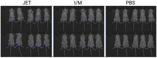 Visualization with in vivo imaging images showing the distribution of mRNA-RBD-Cy5 at the injection site, obtained using the VISQUE InVivo Series Smart-LF. mRNA-RBD-Cy5 was injected by jet injection into the quadriceps muscle of the left hind leg (JET) and intramuscularly (I/M) into the quadriceps muscle of the right hind leg of mice. Mice injected with PBS into the left hind leg were used as negative controls.