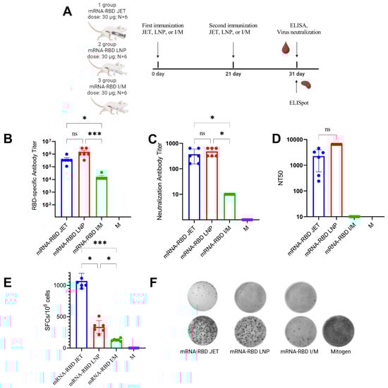 Synthesis of mRNA and encapsulation in LNPs were performed as described in the Materials and Methods. The average mRNA-RBD-LNP particle size was 145 nm, the polydispersity index was <0.15, the zeta potential was 0.23 mV, and the encapsulation efficiency was >98%. The immunization scheme for the animals is shown in Figure 4A. The humoral immune response to the mRNA-RBD vaccine was assessed by measuring the levels of RBD-specific antibodies and viral neutralizing activity in serum from immunized mice, which was collected on day 31 of the study. To evaluate RBD-specific antibody levels, sera from immunized animals were analyzed by ELISA. The mean RBD-specific antibody titer in group 1 mice (mRNA-RBD JET) was 1:400,967, and in group 2 mice (mRNA-RBD LNP), it was 1:1,530,922. However, the difference between these groups was not statistically significant (p = 0.213), indicating that both mRNA-RBD delivered via jet injection and mRNA-RBD encapsulated in LNPs and administered intramuscularly elicited comparable immune responses. The lowest antibody titer was observed in group 3 (mRNA-RBD I/M) at 1:16,200, which was 25-fold lower than that in group 1 (1:400,967).
