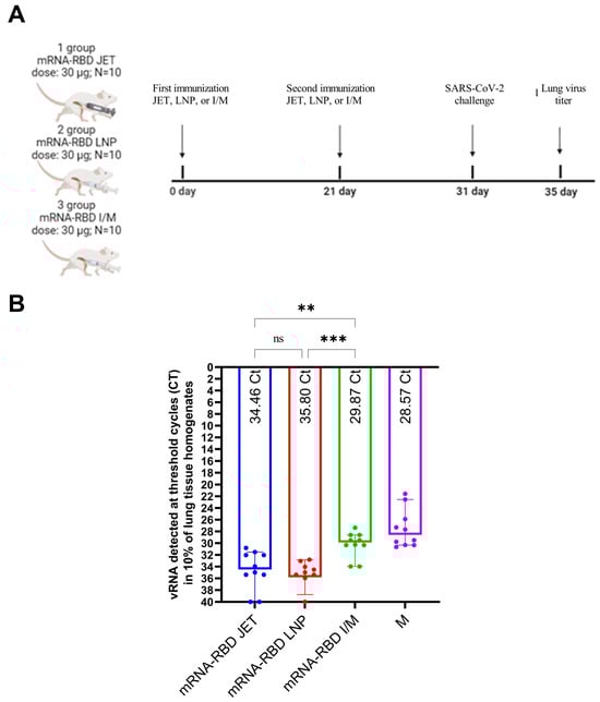 Examination of the protective activity of mRNA-RBD. (A) Immunization scheme. (B) Viral load in lung tissues of BALB/c mice on day 4 after infection with SARS-CoV-2 hCoV-19/Russia/SA-17620-080521/2021. Individual threshold cycle (Ct) values in real-time RT-qPCR are represented by dots; numerical values (Ct) are indicated at the base of the histograms. Statistical analysis was performed using the Kruskal–Wallis test (ns p > 0.05; ** p < 0.01; *** p < 0.001). Designations: mRNA-RBD JET—mice immunized with naked RNA by jet injection, mRNA-RBD LNP—mice immunized with mRNA encapsulated in LNP, mRNA-RBD I/M—mice immunized with naked RNA by intramuscularly, M—control (non-immunized) mice.