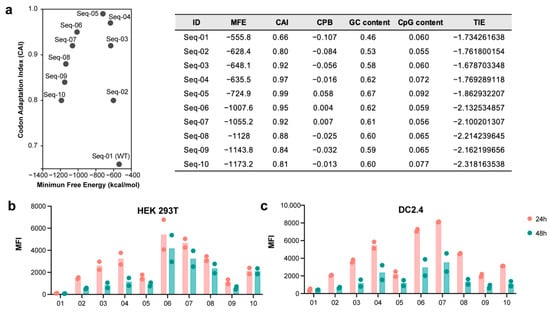 Design and translation of mRNAs into VZV gE protein. (a) mRNA sequences with different designs are shown, along with their respective CAI and MFE values. Additional relevant parameters are listed on the right. (b,c) gE mRNAs were transfected into HEK-293T or DC2.4 cells using jetMessenger. Cells were collected at 24 or 48 h post transfection and analyzed for gE antigen expression by flow cytometry. Data from two independent experiments are shown. CPB, codon pair bias; TIE, translation initiation efficiency.