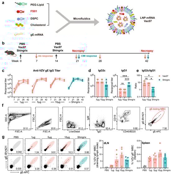 Evaluation of antibody and memory B cell responses induced by Vac07 and Shingrix. (a) Schematic representation of the formulation procedure for the VZV mRNA vaccine. (b) Experimental design: C57BL/6 mice were immunized i.m. with escalating doses of the VZV mRNA vaccine Vac07 (n = 6), 0.1 human dose of Shingrix (n = 5), or PBS (n = 4). Blood samples were collected at specified time points to measure antibody levels, while spleens and dLNs were harvested 28 days post booster for further analysis. (c) Anti-gE IgG titers were measured by ELISA, and the endpoint titers are shown. (d) Anti-gE IgG1 and IgG2c titers at day 28 were measured by ELISA, and the endpoint titers are shown. (e) The ratio of IgG2c/IgG1 is shown. (f) Gating strategy used for identifying class-switched gE-binding MBC. Data from one representative animal is shown. The gating strategy used was as follows: First, 1 million cells were stained, and IgM and IgD antibodies were used to exclude cells that had not undergone antibody class-switching. CD19 and CD45/B220 were then used to label memory B cells. Finally, gE protein conjugated with two fluorophores (APC and BV421) was used to label the class-switched memory B cells specific to gE binding. The numbers in the figure represent the percentage of each cell population relative to the parent gating step. The right panel shows the data summary results. (g) Frequencies of class-switched (IgD-IgM-) gE-specific MBCs in dLNs and spleens were analyzed by flow cytometry. The left panel shows the flow cytometry representative plots, with each plot displaying a cell count of 3000. The numbers in the figure represent the frequency of class-switched gE-binding MBCs. Data are shown as mean ± SEM. One-way ANOVA with multiple comparisons tests was used for the analysis of statistical significance. ns, indicating no significant difference; * p ≤ 0.05, *** p ≤ 0.001.