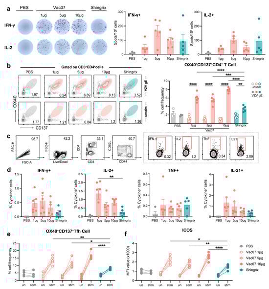 Given that T cell responses play a key role in preventing VZV reactivation [16,31], we focused more on the T cell-mediated responses elicited. First, on day 7 after the booster, spleens were harvested, and ELISpot assays revealed that the 5 µg Vac07 induced the highest levels of IFN-γ- and IL-2-secreting T cells (Figure 3a). On day 28 post booster, Vac07-vaccinated mice showed a stronger induction of gE-specific AIM+ (activation-induced markers OX40 and CD137) CD4+ T cells upon antigen stimulation in spleens (Figure 3b). We further employed a well-established intracellular cytokine recall assay (Figure 3c) to assess the induction of gE-specific CD4+ T cells producing IFN-γ, TNF, IL-2, and IL-21 following gE antigen stimulation (Figure 3d). Compared with Shingrix, Vac07 could moderately increase the frequency of Th1-type CD4+ T cells that specifically secrete IL-2 and IFN-γ in the spleen, while the frequency of TNF-secreting CD4+ T cells was basically the same. Moreover, there was no apparent dose-dependent effect. IL-21, a cytokine specifically secreted by T follicular helper (Tfh) cells, was then examined. We observed a significant expansion of gE-specific AIM+ Tfh cells, defined as OX40+CD137+CD4+CXCR5+ T cells, particularly in mice vaccinated with Vac07 (Figure 3e). Additionally, these vaccine-induced Tfh cells displayed a highly activated phenotype with elevated ICOS expression (Figure 3f). Collectively, these findings demonstrate that Vac07 induces VZV-specific T cell responses in mice that are comparable to, or even slightly stronger than, those induced by Shingrix.