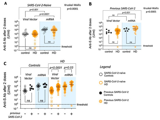 Figure 1. Antigen-specific antibody in sera collected 21–28 days after two doses of SARS-CoV-2 vaccine—comparison between controls and patients requiring HD. Comparisons of anti-S antibody levels between controls (black symbols) and patients requiring HD (orange symbols)—shown in legend. Filled symbols represent individuals with previous SARS-CoV-2 infection. Blue columns denote data from mRNA vaccinees. (A) Data from SARS-CoV-2-naïve individuals only; (B) data from individuals with previous SARS-CoV-2 infection only; (C) all data shown. Threshold level of antibody detection (“seropositivity”) shown as dashed line (0.8 U/mL). Kruskal–Wallis test used to compare groups in panels (A,B), with post hoc Dunn’s multiple comparison p values shown (ns denotes not significant; p > 0.05). The Mann–Whitney U test is used for pre-defined comparisons within groups in panel (C).