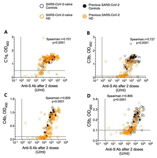 Figure 2. Correlation between anti-S antibody levels and the binding of complement components in controls and patients requiring HD. Data shown for all seropositive individuals—(AD) correspond to C1q, C3b, C4b, and C5b, respectively.