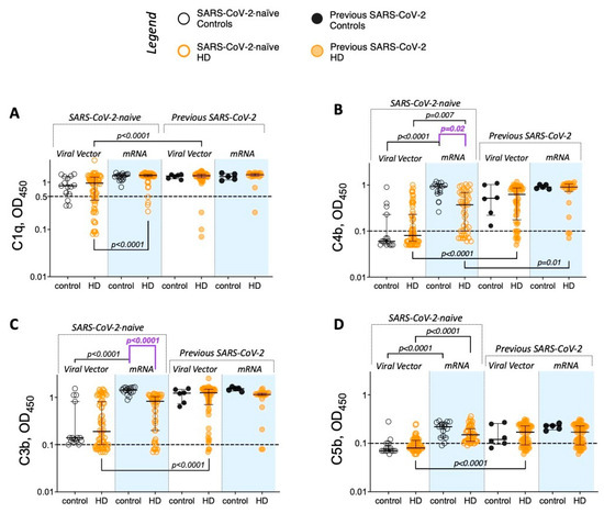 Overall, when stratified by vaccine type and previous SARS-CoV-2 exposure, patients requiring HD exhibited greater heterogeneity than controls in the levels of complement binding detected (Figure 3A–D). Interestingly, despite having similar anti-S levels, SARS-CoV-2-naïve mRV vaccinated HD patients showed a significantly lower deposition of C4b and C3b than controls matched for vaccine type and previous pathogen exposure (Figure 3B,C—comparisons highlighted in purple).