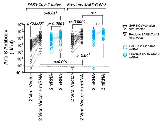 Figure 4. Anti-S antibody levels in sera of HD patients 21–28 days after two and three vaccine doses. Anti-S antibody levels in HD patients after two and three vaccine doses—comparisons by first vaccine type (grey—viral vector; blue—mRNA), split by previous SARS-CoV-2 infection (filled symbols denote previous infection)—see legend. Paired statistical comparisons performed between timepoints using Wilcoxon’s signed-rank test (post-dose two vs. post-dose three levels), and Mann–Whitney’s U test was used to compare antibody levels at the same timepoints by previous SARS-CoV-2 exposure (denoted by $).