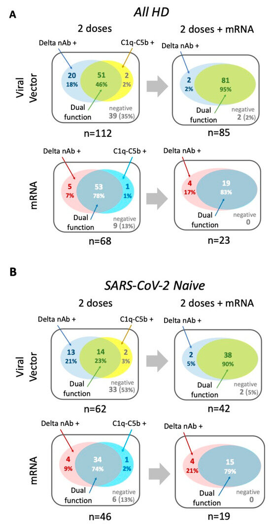 Figure 5. Antigen-specific antibody functionality in patients requiring HD—comparison between two and three vaccine doses. (A) Diagrammatic representation of antigen-specific antibody functionality after two and three vaccine doses for all HD patients—comparisons by vaccine type. Venn diagrams showing the overlap of neutralisation activity against Delta VoC (Delta nAb +) with the binding of all four complement components tested (C1q-C5b +) to denote antibody with dual function; n and % of total for whom data were available are shown. (B) As above, but for SARS-CoV-2-naïve HD patients only.