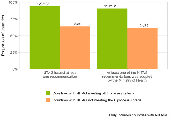 Figure 2. Proportion of countries with a NITAG that, in 2023 (i) had a NITAG issuing recommendations, and (ii) had NITAG recommendations adopted by the Ministry of Health, by their process-criteria status.