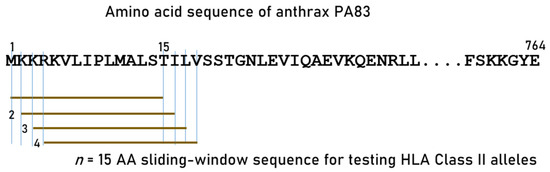 We tested exhaustively all linear 15-AA length subsequences (epitopes; 15-mer) of PA using a sliding window approach [2] to partition the whole AA sequence of PA (number of 15-mer epitopes = 764 AA − 15 AA = 750; Figure 1). Predicted binding affinities of each PA epitope to each HLA Class II molecule carried by the Gulf War veterans were obtained for PA epitopes using the Immune Epitope Database (IEDB) NetMHCpan (version 4.1) tool [36,37]. For each pair of peptide–HLA molecule (pHLA-II) tested, this tool gives, as an output, the ic50 of the predicted binding affinity (PBA); the smaller the ic50, the stronger the binding affinity; an ic50 value of ≤50 nm is regarded strong [38]. We called these strong binders “hits” and assigned them a value of 1; PBA values > 50 nM were assigned the value 0. Thus, for a peptide