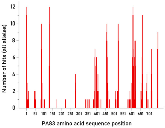 The purpose of this analysis was to identify PA 15-mer epitopes with high PBA over all alleles tested. Such epitopes would be good candidates as constituents of peptide, multiepitope-based, anti-anthrax PA vaccines. The number of hits for each of the 750 15-mer epitopes tested is given in Table S4 (together with their mean ic50 values) and shown in Figure 6 along the PA amino acid sequence. Altogether, there were 180/750 (24%) 15-mer epitopes with hits, i.e., strong binding affinities to HLA-II molecules; these epitopes would have a good chance to engage CD4+ lymphocytes to initiate the process of antibody production. An additional consideration with respect to the practical value of specific epitopes in vaccine development concerns the number of strong HLA-II binders for a particular epitope. This number ranged from 1 to 12, as shown in Table S5 and depicted in Figure 7; epitopes that can bind strongly to more HLA-II molecules would be better candidates for multi-epitope anti-anthrax vaccine development.
