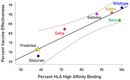 The effectiveness of a vaccine in protecting against a disease upon exposure depends on the presence of effective antibodies against the offending microorganism [39,40]. Now, the first necessary step in the process of initiating antibody production is the formation of a stable pHLA-II complex [20,21,22,23], which defines most exclusively T cell epitopes [22,23,41,42]. It follows that peptide binding to an HLA-II molecule is the prerequisite for CD4+ T cell recognition for initiating antibody production by B cells in otherwise immunocompetent individuals and ensuing vaccine effectiveness. These considerations imply that the effectiveness of a vaccine will depend on the strength of the binding affinity of the epitopes used in the vaccine to HLA-II molecules. In a clinical setting of evaluating vaccine effectiveness, the same vaccine is administered to many individuals, which means that the same antigen epitopes are presented to the many different HLA-II molecules carried by the individuals in the vaccinated population. Therefore, the hypothesized dependence of clinical vaccine effectiveness on the strength of peptide (epitope)-HLA-II molecules can be tested by assessing the dependence of the average outcome of clinical studies of vaccine effectiveness on the average strength of peptide–HLA-II binding affinity. Of these two crucial measures, the outcome of clinical studies is known directly, whereas the pHLA-II binding affinity can be estimated in silico using well-established, reliable prediction algorithms [36,37,43,44]. Indeed, we successfully tested this hypothesis in the context of vaccines made for five variants of the SARS-CoV-2 virus (Wildtype, Alpha, Beta, Gamma, Delta, Omicron) and 56 common HLA-II alleles with frequencies ≥ 0.01 [45]. We found that the average clinical vaccine effectiveness was highly correlated with the average high in silico predicted binding affinity of the SARS-CoV-2 variant spike glycoprotein epitopes to the HLA-II molecules tested (