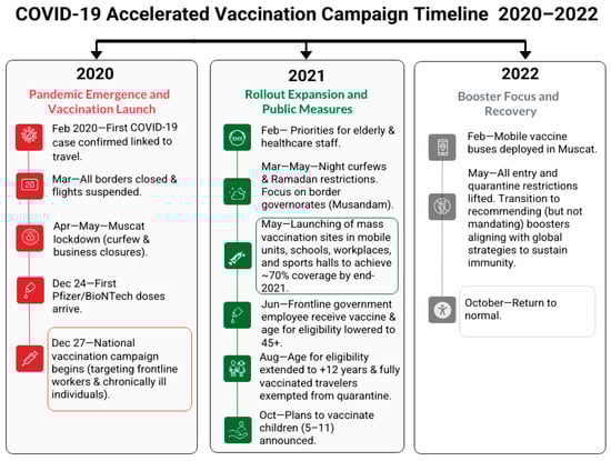 Oman launched its COVID-19 vaccination campaign in December 2020, implementing a structured and phased approach to immunizing its population (Figure 1) []. Initially, the vaccination effort prioritized high-risk groups due to limited vaccine supplies and high global demand. This priority framework targeted vulnerable populations, including frontline healthcare workers and individuals with chronic health conditions, to mitigate the immediate impact of the pandemic. Following this, Oman established a strategic objective to vaccinate 70% of its total population, which would occur in two phases: the first phase aimed to cover 30% of the population starting in late 2020, and the second phase planned to reach the remaining 40% from July to October 2021 [].