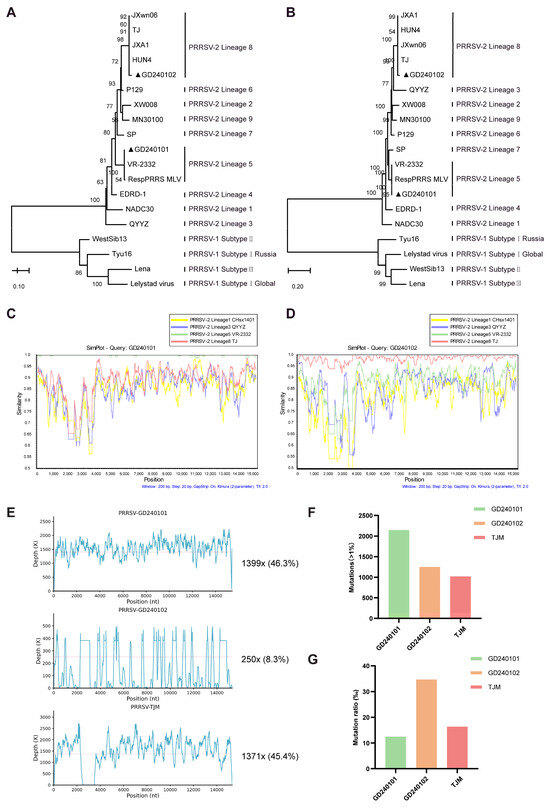 Baseline characterization of farm endemic PRRSV strains and pre-vaccination viral population. (A,B) Phylogenetic analysis based on ORF5 genes (A) and the complete genome sequences (B) of the farm isolates GD240101 and GD240102 (marked by ▲) alongside reference PRRSV strains. (C,D) Recombination analysis comparing the complete genomes of GD240101 (C) and GD240102 (D) against representative strains from different PRRSV-2 lineages using SimPlot. (E) Baseline average sequencing depth (×) detected by NGS in pooled serum and saliva samples from gilts before vaccination (0 dpv). (F) Baseline number of accumulated mutations (frequency > 1%) detected for each strain. (G) The baseline mutation ratio (‰) was calculated for each strain.