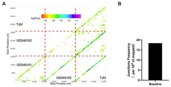 Baseline mutations (Figure 1F) and mutation ratio (Figure 1G) demonstrate that, despite GD240101 exhibiting a higher number of mutation sites than GD240102, GD240102 manifests the highest mutation ratio. The accumulation of these mutations in these strains gives rise to high-abundance clusters and can result in recombination within or among strains due to the low RNA-dependent RNA polymerase (RdRp) fidelity of RNA viruses [24]. In addition to the presence of self-recombination (three regions of the nine-cell grid that belong to the same strain both horizontally and vertically), more recombination signals among strains have been observed in regions of the nine-cell grid that belong to different strains, both horizontally and vertically (Figure 2A). The baseline junction frequency was 18.34 per 104 nt mapped (Figure 2B). The recombination baseline condition revealed a complex status of infection in pigs.