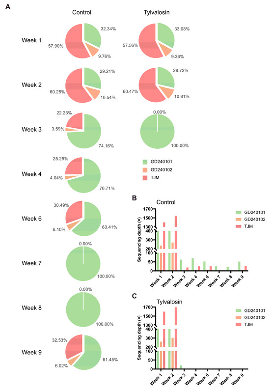 The average sequencing depth (raw data in Figure S1) of control (Figure 4B) and tylvalosin (Figure 4C) groups are indicative of detectable viral RNA. While both groups demonstrated a substantial decrease in overall viral RNA (lower depths for all strains) from week 3 onwards compared to weeks 1 and 2, the tylvalosin group exhibited a more profound and sustained reduction. Specifically, the depth for the TJM strain dropped to 20× by week 3 and remained at zero thereafter in the tylvalosin group (Figure 4C). In the control group, although depths decreased after week 2, low levels of TJM, GD240101, and particularly GD240102 RNA persisted intermittently through week 9 (Figure 4B), aligning with the relative abundance data.