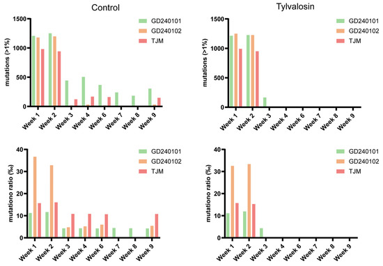 The accumulation of mutations (frequency > 1%) and the genome-wide mutation ratio (‰) were analyzed over time for each detectable strain (Figure 5). In both groups, the number of detected mutations was highest during weeks 1 and 2, when viral loads (sequencing depths) were at their peak and decreased substantially. The GD240102 demonstrated a higher mutation ratio than the TJM and GD240101 in the initial weeks of the study in both groups. Nevertheless, no consistent or discernible disparities were identified in the number of accumulated mutations or the mutation ratios between the tylvalosin and control groups for any given strain during the periods in which they were reliably detected. This finding suggests that, within the specified timeframe and detection limits of this study, the tylvalosin usage did not appear to exert strong selective pressure, leading to substantial divergence in viral mutation patterns compared to the control group.