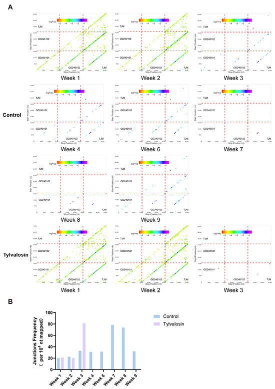 To investigate the impact of tylvalosin on recombination during MLV immunization, we analyzed recombination patterns using NGS data. In the first two weeks following MLV vaccination, which corresponded to the peak viremia and highest viral loads detected, recombination activity remained prominent in both experimental groups. The dot plots for week 1 and week 2 (Figure 6A) exhibited a resemblance to the baseline complexity before vaccination, displaying numerous off-diagonal recombination signals across both intra- and inter-strain comparison regions. This finding suggests that the introduction and subsequent rapid replication of the TJM vaccine strain, in conjunction with the existing field strains provided an ample opportunity for genetic exchange. The calculated junction frequencies, raised from 18.34 junctions/104 nt, reflected this activity and were comparable between 20.04 junctions/104 nt (control) versus 21.15 junctions/104 nt (tylvalosin) at week 1, and 22.51 junctions/104 nt (control) versus 20.12 junctions/104 nt (tylvalosin) at week 2 (Figure 6B). This initial similarity highlights that both groups initiated with comparable levels of active viral replication and associated recombination following vaccination. However, a marked divergence emerged from week 3 onwards, coinciding with the divergent viral clearance patterns observed between the groups. In the control group, evidence of ongoing recombination persisted throughout the 9-week observation period with dot plots consistently showing numerous off-diagonal signals.