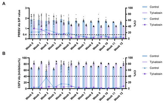 Humoral immune responses to PRRSV and CSFV. Kinetics and uniformity of serum antibody responses over 12 weeks post-vaccination for the control and tylvalosin groups. (A) PRRSV antibody S/B value (bars and points, left y-axis) and CV% (line, right y-axis). Dashed lines indicate positive cutoff values of 0.4. (B) CSFV antibody inhibition rate (bars and points, left y-axis) and CV% (line, right y-axis). Dashed lines indicate positive cutoff values of 40%.